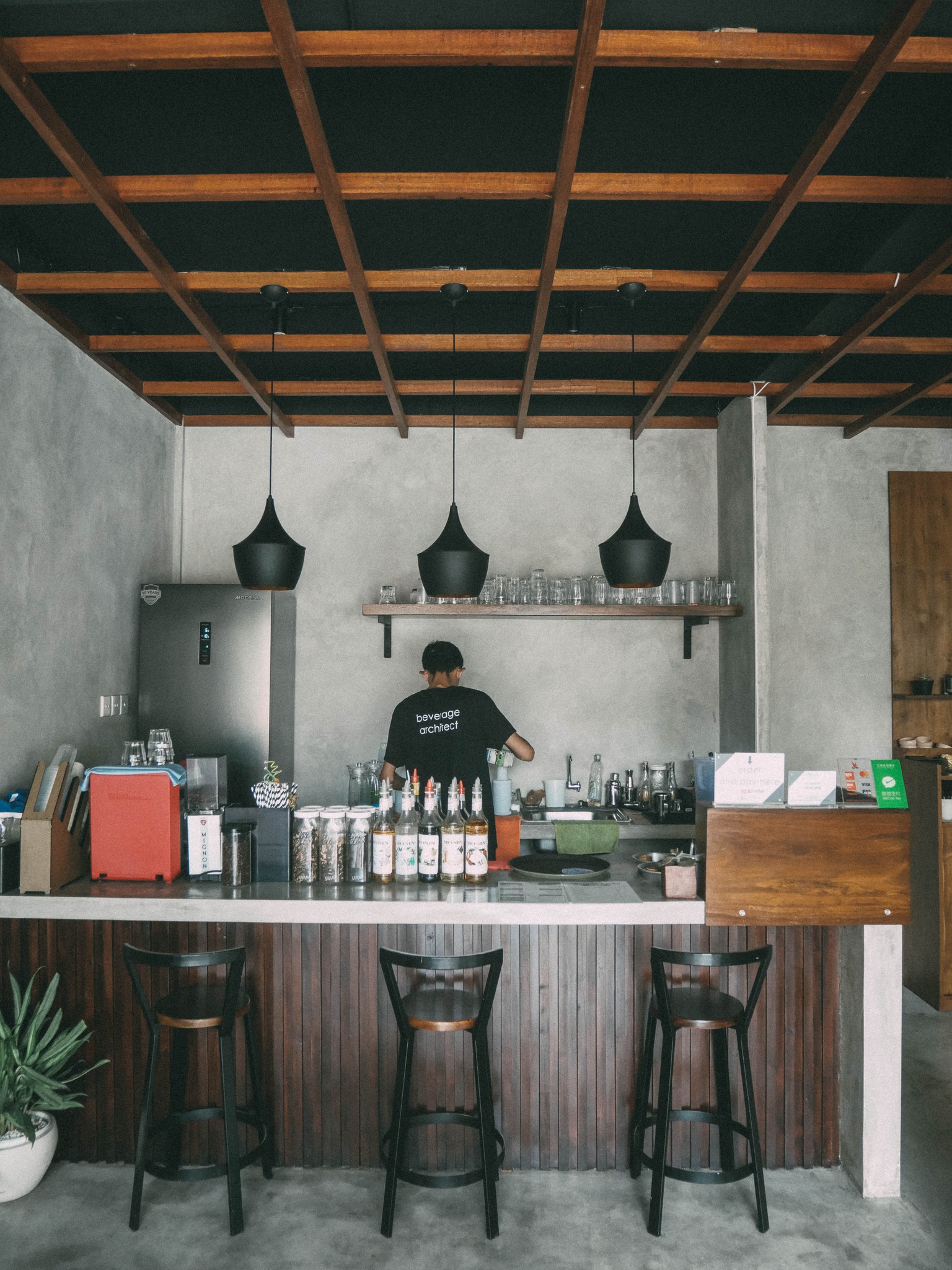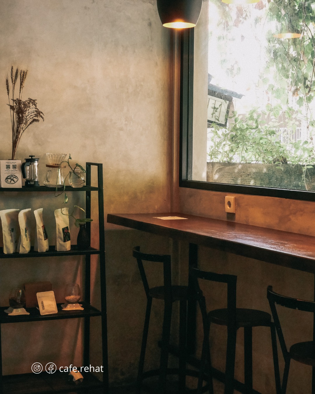kedai kopi minimalis dengan tema industri yang diterjemahkan melalui penggunaan bahan yang belum selesai dikombinasikan dengan elemen kayu alami. bahkan ruang terbatas, tata letak desain dibuat sederhana dan nyaman bagi pengunjung.